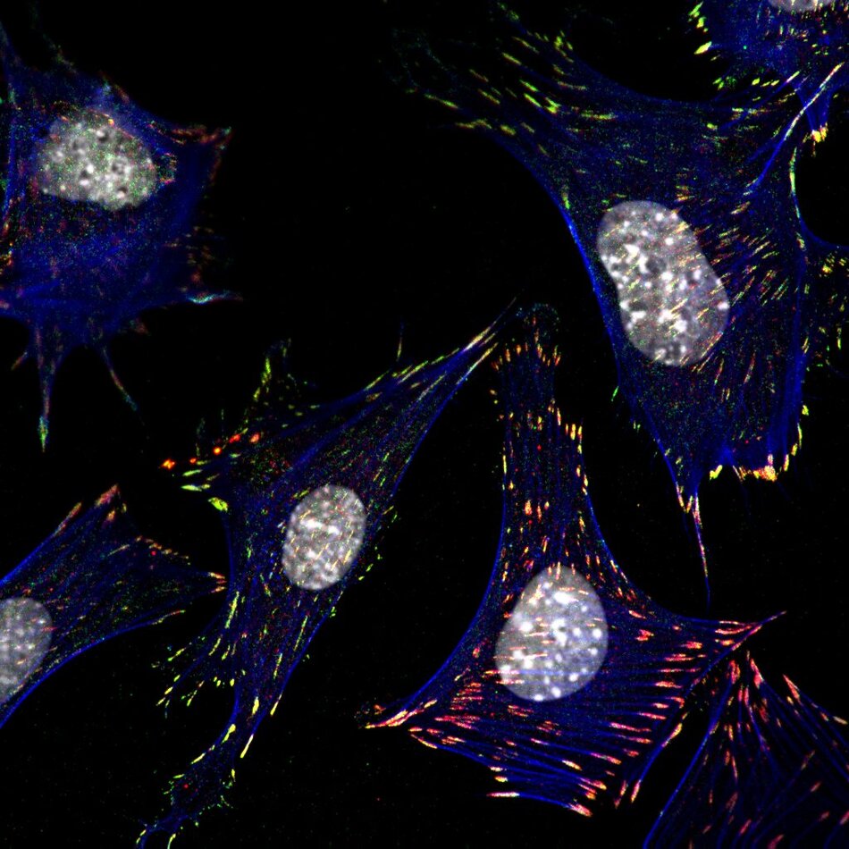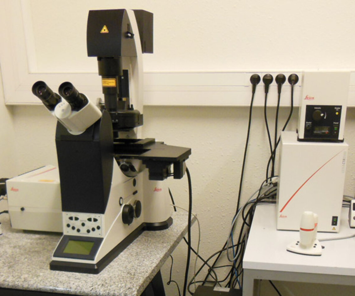 Le principe de la microscopie confocale à balayage laser est de réaliser des sections optiques permettant une imagerie tridimentionnelle. Le Leica SPE est un système spectral sans filtres qui permet d’adapter la bande spectrale d’émission à tous type de sondes fluorescentes. Il offre une possibilité de balayage spectral pour caractériser un fluorophore ou pour séparer deux sondes dont les spectres se chevauchent. Il est équipé de quatres laser pour couvrir l’ensemble des fluorophores visibles et proche IR. Une approche de screening est réalisée avec le module HSC qui automatise les acquisitions en plaques multipuit.